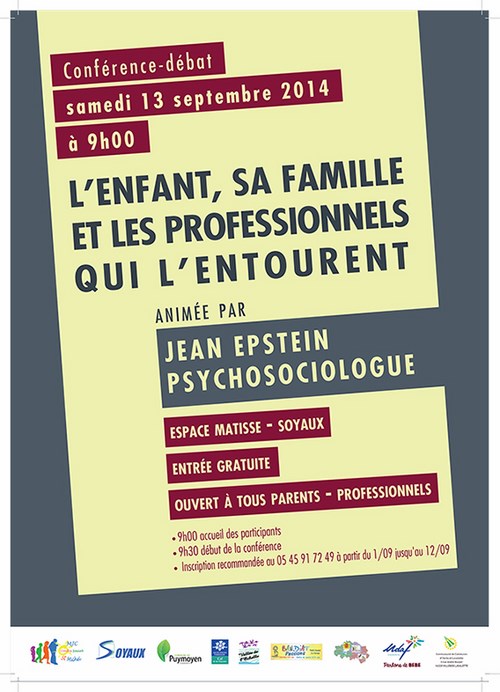 Une conférence-débat autour de « L’enfant, sa famille et les professionnels qui l’entourent » est organisée le samedi 13 septembre 2014 à 9h à l’Espace Matisse à Soyaux.