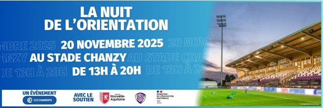 La CCI Charente vous invite à La Nuit de l'Orientation en Charente qui se déroulera le jeudi 20 novembre 2025 de 13h à 20h au Stade Chanzy de Soyaux.