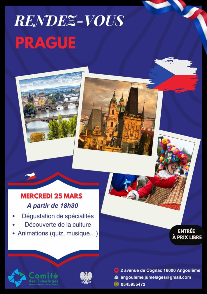 Le Comité des Jumelages d’Angoulême vous invite à une soirée spéciale Rendez-vous à Prague le mercredi 25 mars 2026 à 18h30 dans leur locaux.