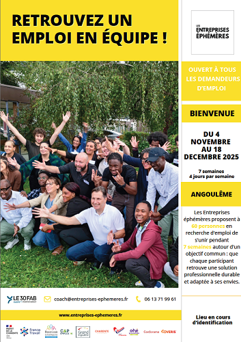 Les Entreprises éphémères proposent à 60 personnes en recherche d’emploi de s’unir pendant 7 semaines (du 4 novembre au 18 décembre 2025 à raison de 4 jours par semaine) autour d’un objectif commun : que chaque participant retrouve une solution professionnelle durable et adaptée à ses envies.